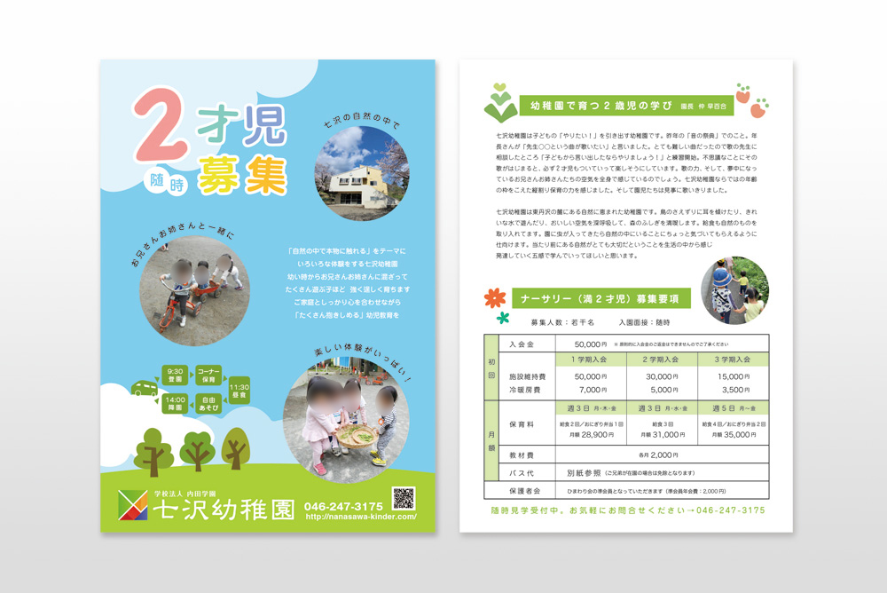 七沢幼稚園の2才児募集のチラシデザインご依頼いただきました。制作にあたって園長先生に2才児から入園することについて伺いました