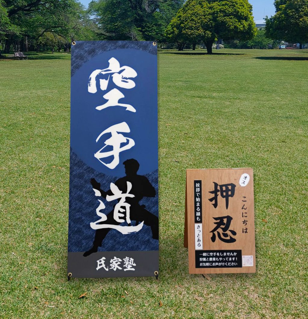 「狩猟・空手・農業で生きていく」という息子へ20才のプレゼント。空手塾の支部長を頑張っているので、道場用のバナースタンドをお祝いに。